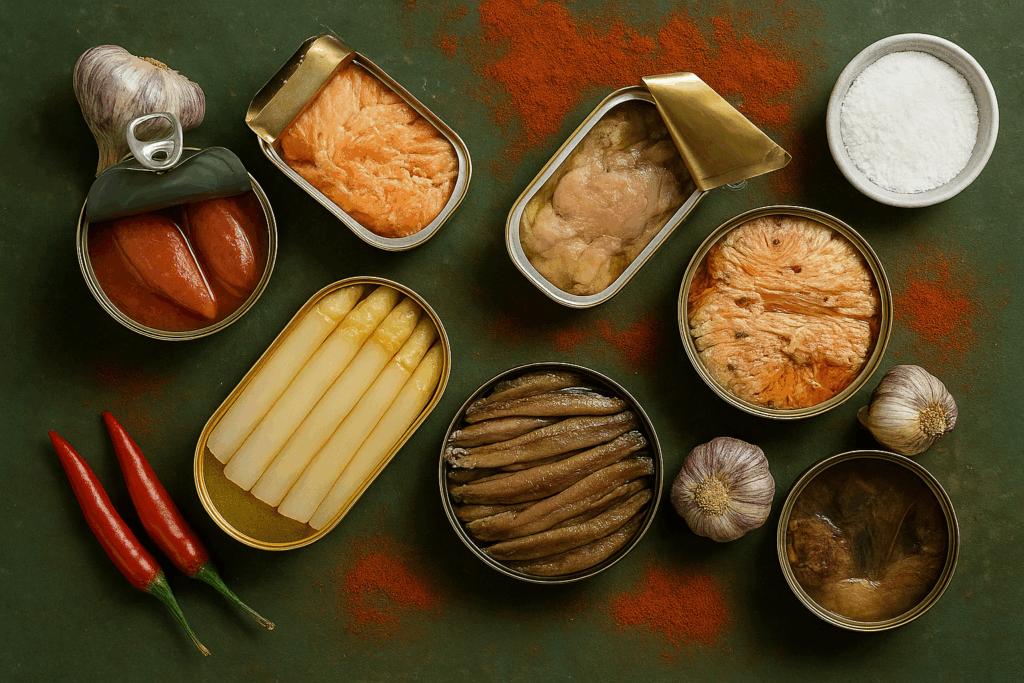 Atún, sardinas, anchoas, mejillones y más, cuidadosamente envasados.